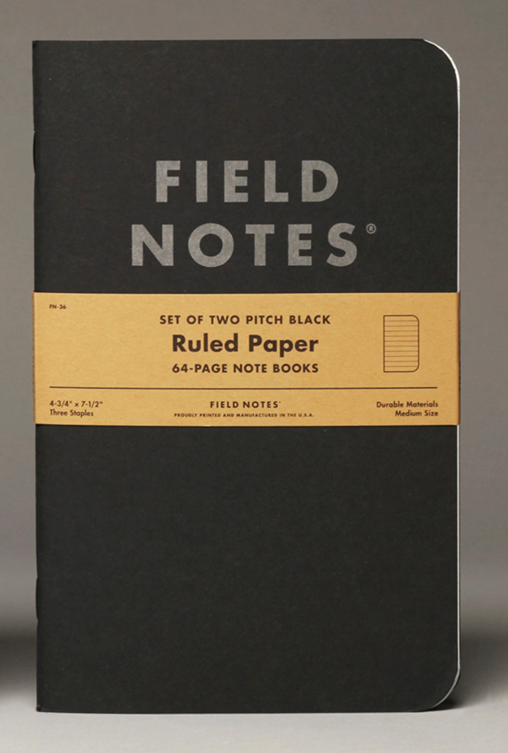 A slightly larger sized two-pack of 64 ruled pages. These note books measure 4.75" x 7.5" and are bound with three staples. Note books feature a black front and back cover with stone gray writing.