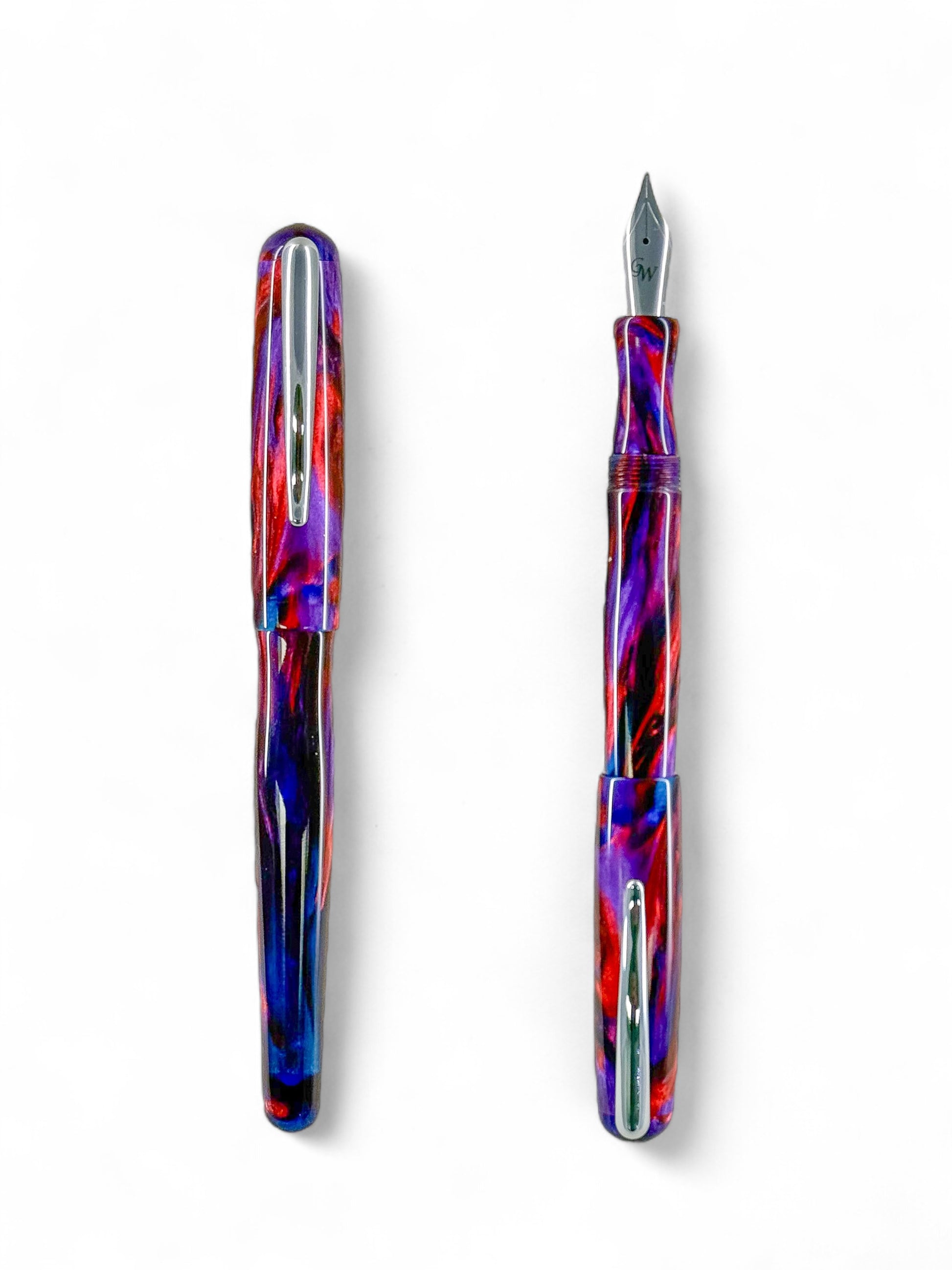 The pen comes with a chrome clip and JoWo #6 steel nib in your choice of Extra Fine through Broad tip. A Schmidt K5 converter is included, but it can also use standard international disposable cartridges. The resin, cast in-house, is ruby red, bright blue, and purple swirls.