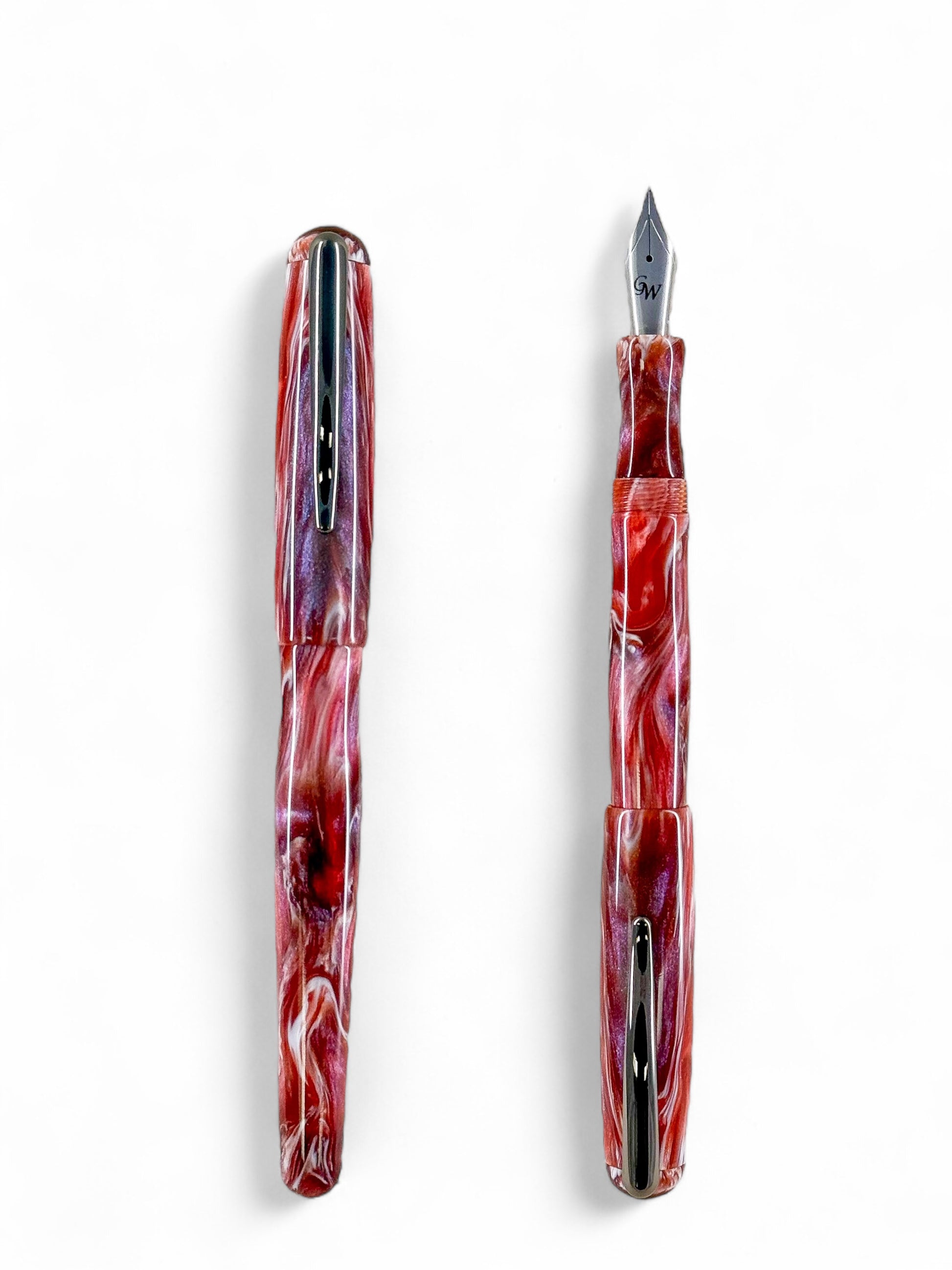 The pen comes with a gun metal chrome clip and JoWo #6 steel nib in your choice of Extra Fine through Broad tip. A Schmidt K5 converter is included, but it can also use standard international disposable cartridges. The resin, cast in-house, features swirls of maroon and white with a two-tone silver element.