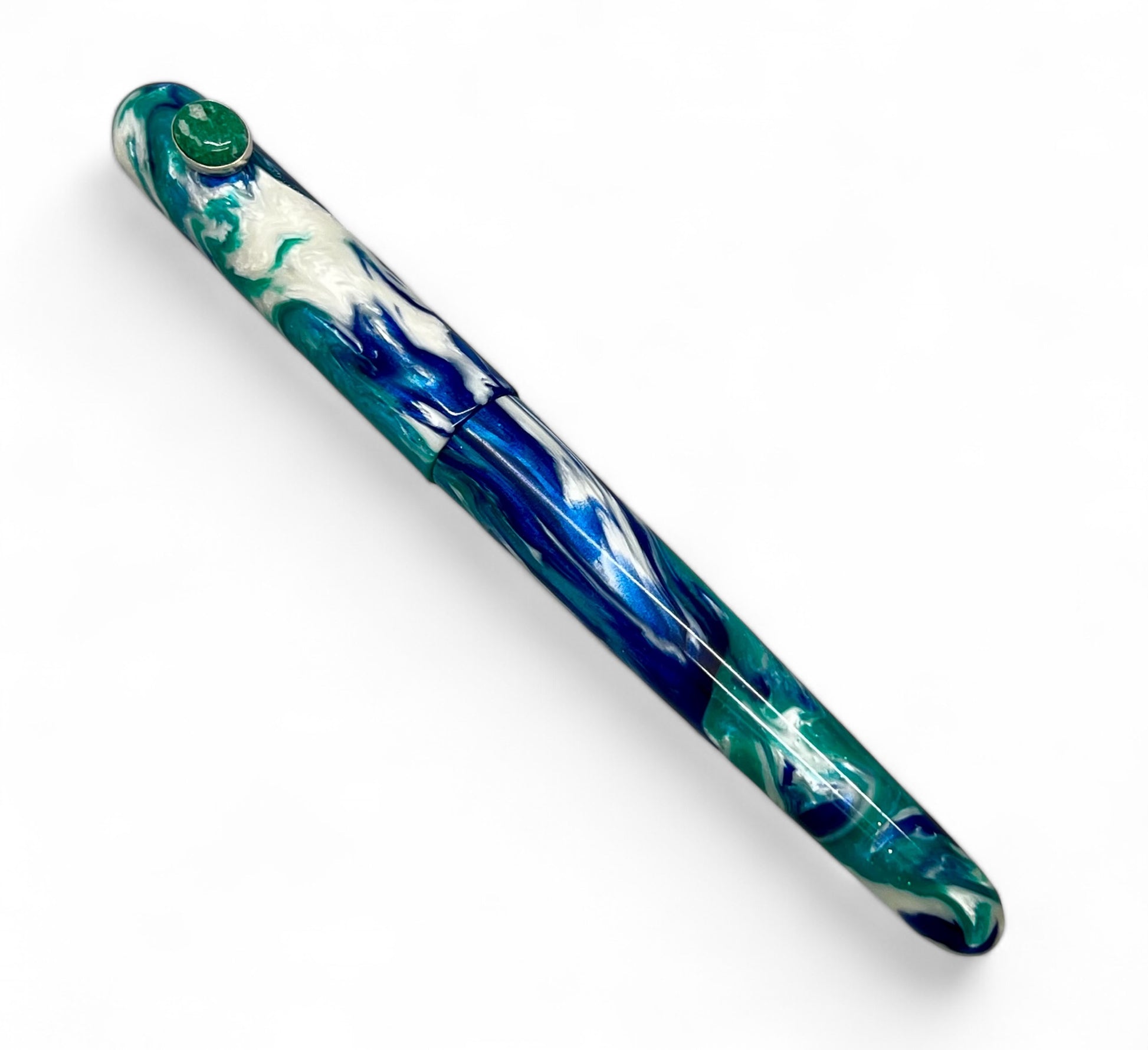 The GemPen 25 has gemstones set in fine silver and affixed to the cap to act as rollstops. This particular fountain pen has Amazonite in fine silver with my in-house Island Vibes resin. The triple start thread cap can post or safely sit on your writing surface worry-free from rolling away!