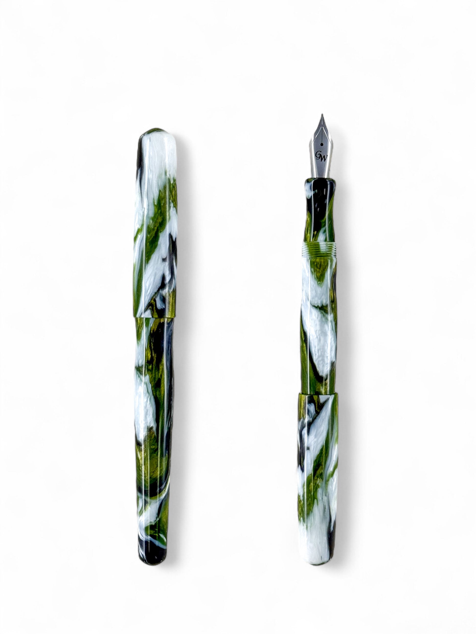 The pen comes with a JoWo #6 steel nib in your choice of Extra Fine through Broad. A Schmidt K5 converter is included, but it can also use standard international disposable cartridges. The resin, cast in-house, is my Swamp Monster series of light and dark green, and black and white.