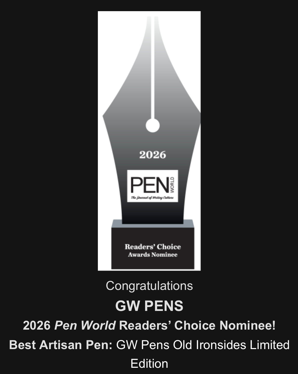 Nominated for the 2026 Pen World Magazine Readers’ Choice Award for Best Artisan Pen