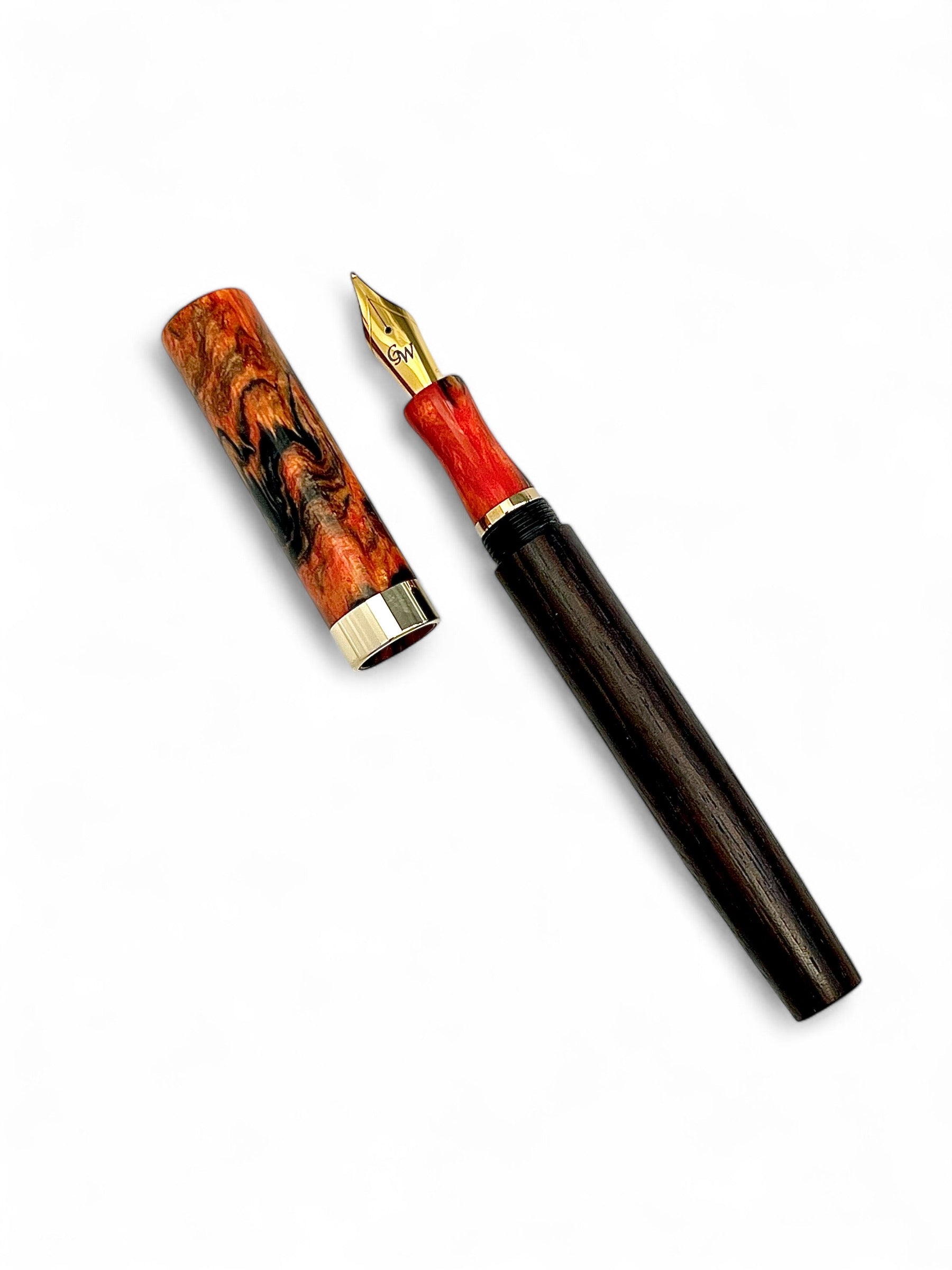 GW Pens is proud to introduce the Sunburst line of pens! The name "Sunburst" is taken from the popular Sunburst style of guitar bodies, painted and stained to have bright orange centers fading out into reds before ending in black along the edges. The resin caps and sections, all cast in-house, incorporate these very colors.