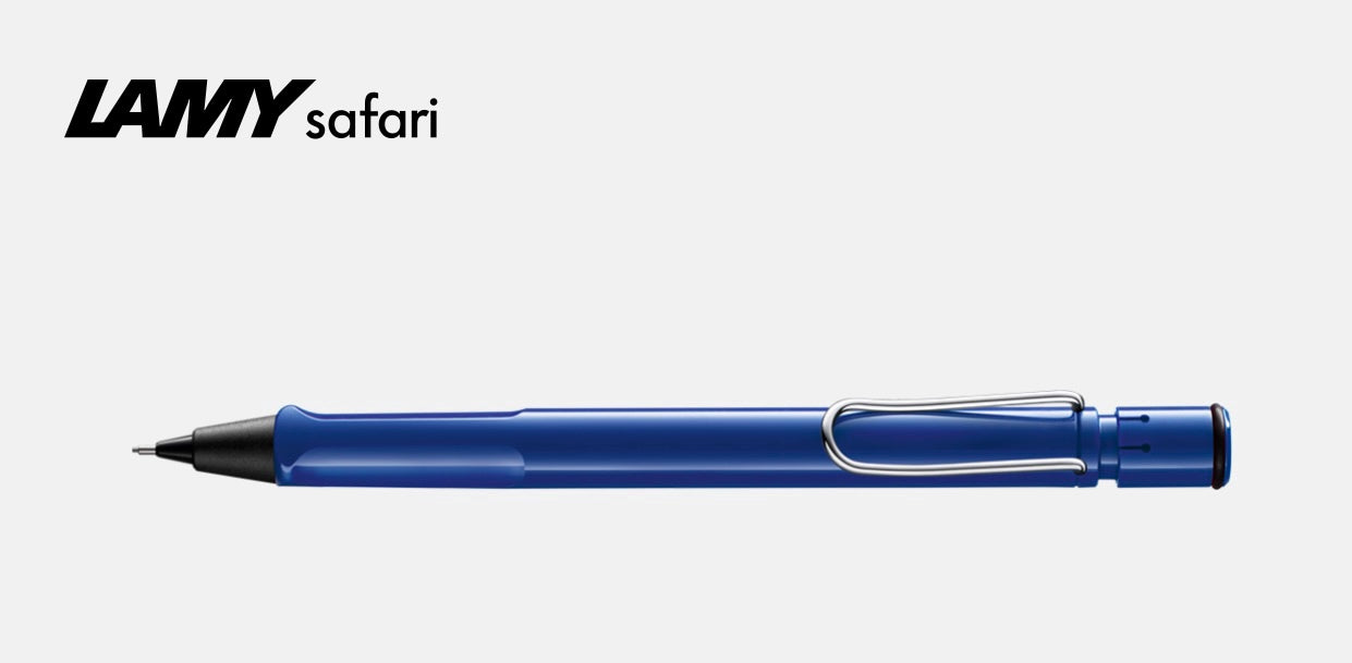This German designed and made mechanical pencil is part of the Lamy Safari line. With a bright blue finish, the pencil is a traditional style click using 0.5mm lead. Features a strong spring-loaded clip and eraser with built in cleaning needle for the tip.