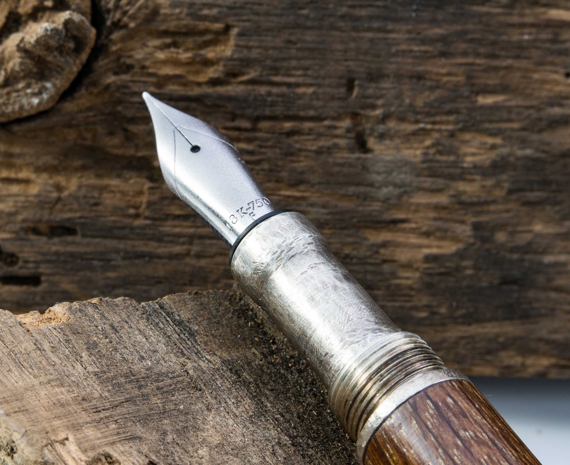 The nib is a rarely seen 18k gold rhodium plated JoWo #6 Fine tip that has been textured through sandblasting. The pen uses cartridges or the included Schmidt K5 converter. It is seated in a solid sterling silver section.