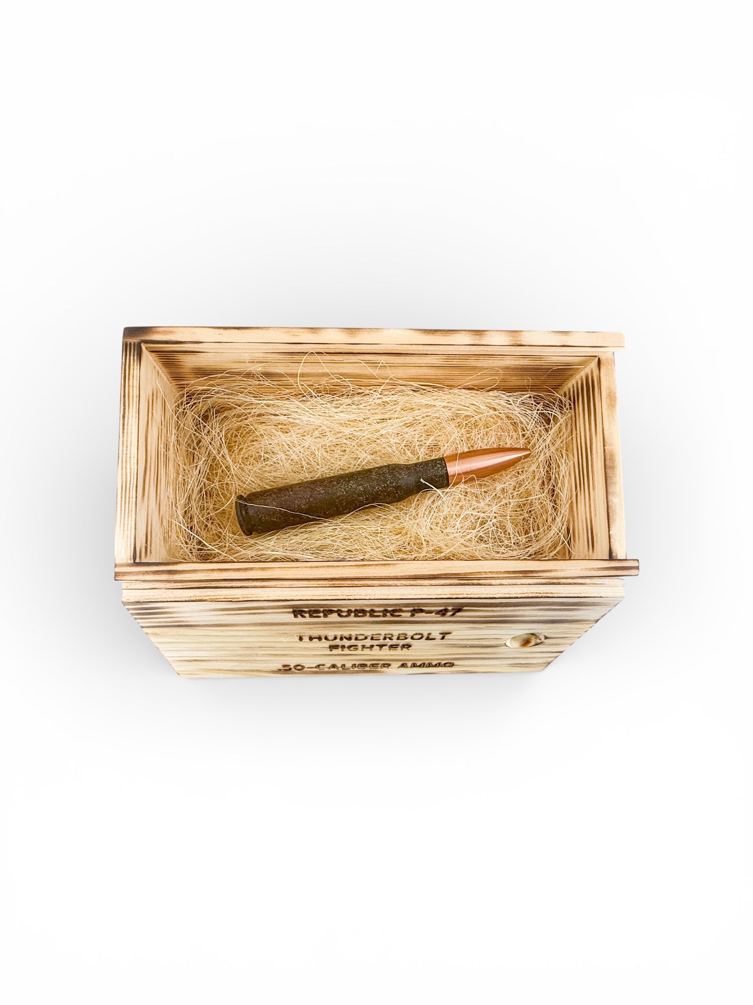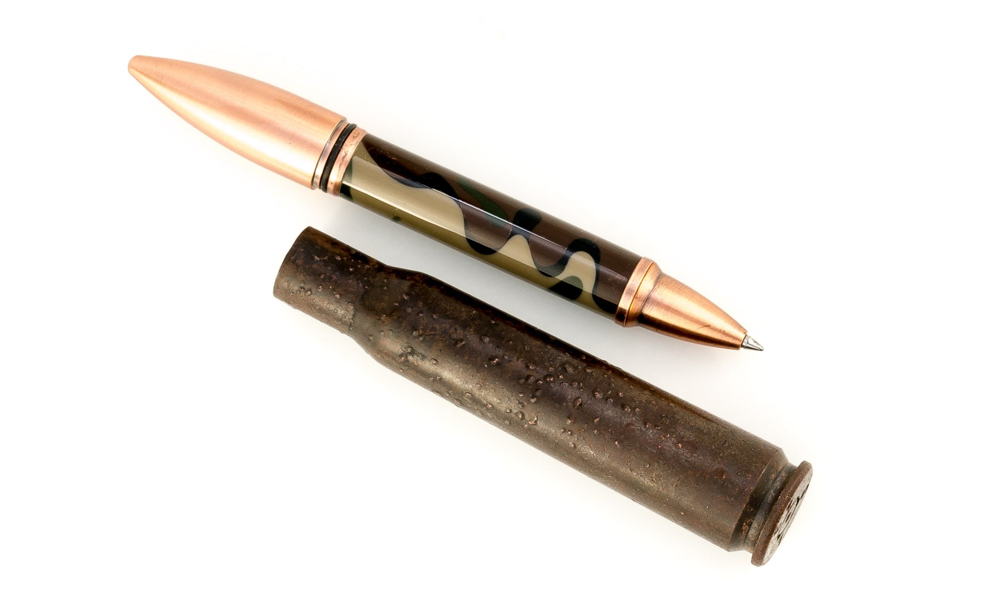 This rollerball pen is housed inside of a 50 caliber shell fired in the 1940's from a P47 fighter plane during WWII Advanced Fighter Pilot Training. The shells were buried in the ground for nearly 70 years before they had to be dug out one by one when a racetrack was about to be built in the area.